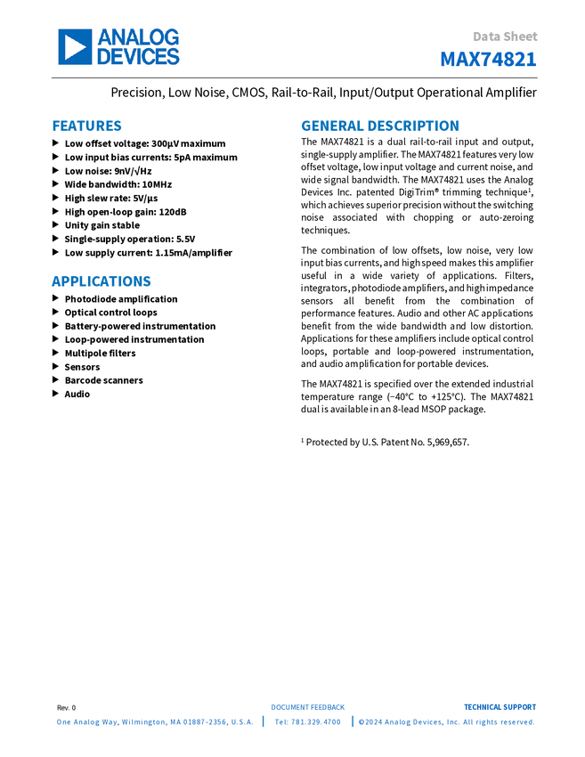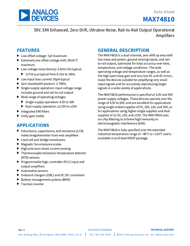 50V, EMI Enhanced, Zero Drift, Ultralow Noise, Rail-to-Rail Output Operational Amplifiers