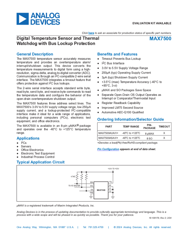 MAX7500, MAX7501, MAX7502, MAX7503, MAX7504 Digital Temperature Sensors and Thermal Watchdog with Bus Lockup Protection