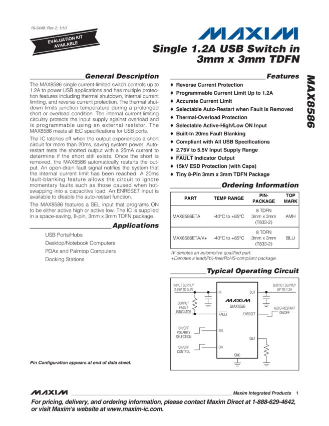 MAX8586 Single 1.2A USB Switch in 3mm x 3mm TDFN