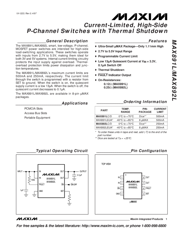 MAX891L, MAX892L Current-Limited, High-Side P-Channel Switches with Thermal Shutdown