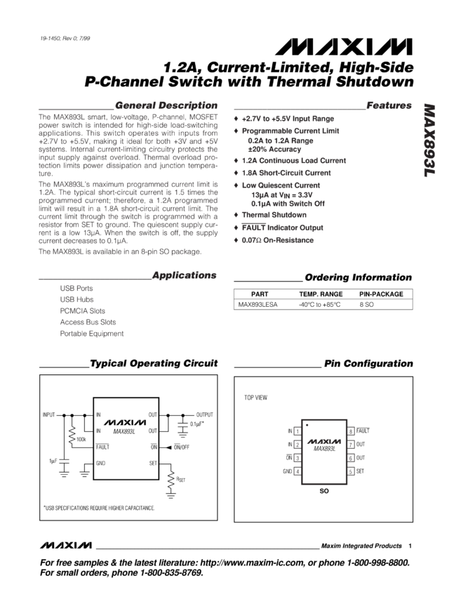 MAX893L 1.2A, Current-Limited, High-Side P-Channel Switch with Thermal Shutdown