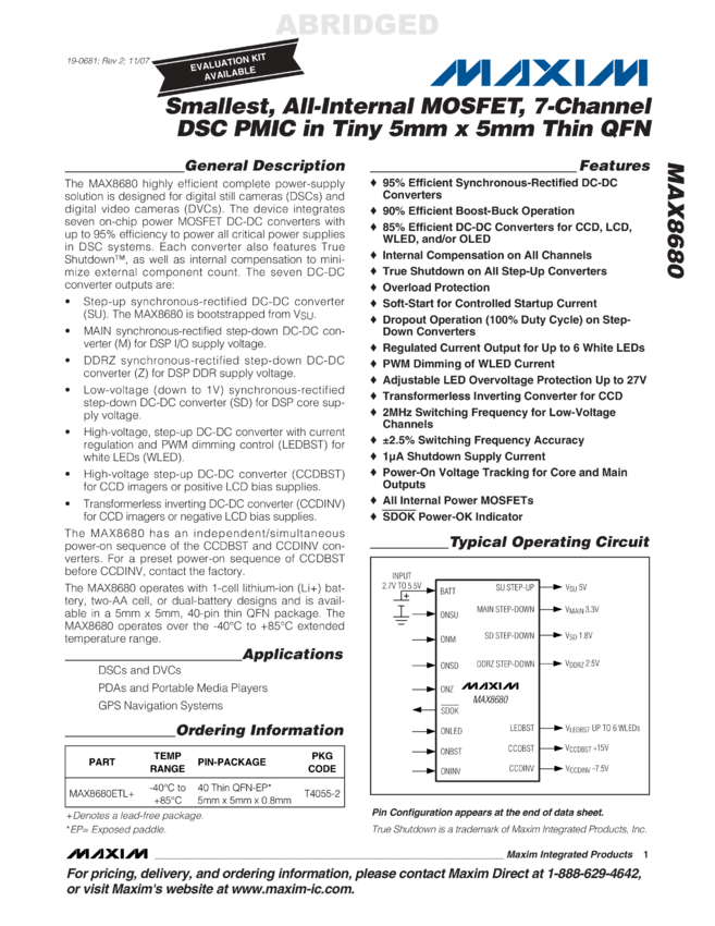 MAX8680 Smallest, All-Internal MOSFET, 7-Channel DSC PMIC in Tiny 5mm x 5mm Thin QFN