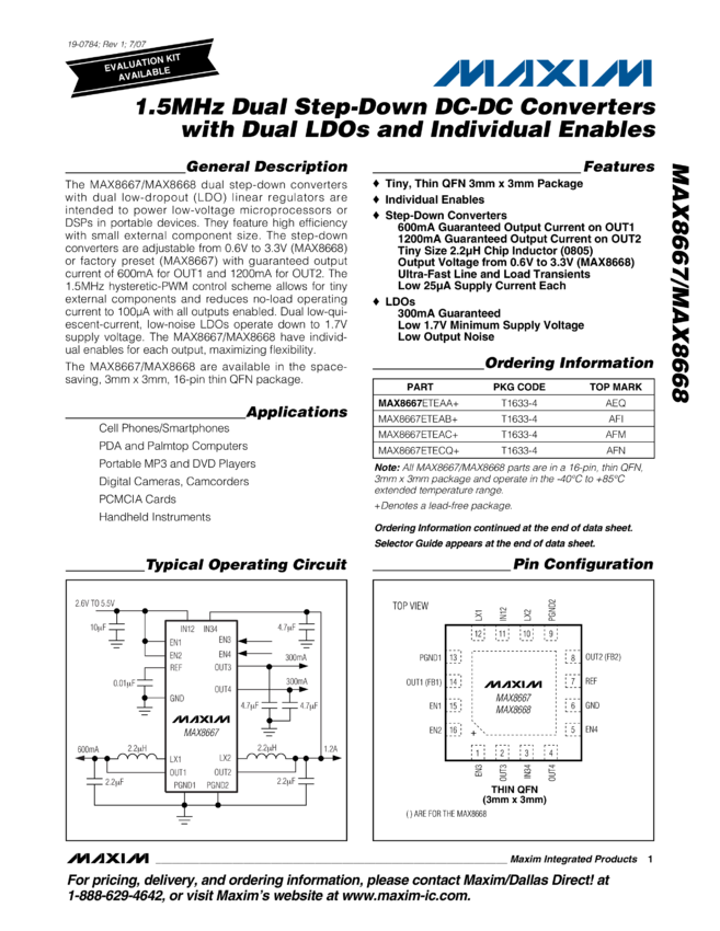 MAX8667, MAX8668 1.5MHz Dual Step-Down DC-DC Converters with Dual LDOs and Individual Enables