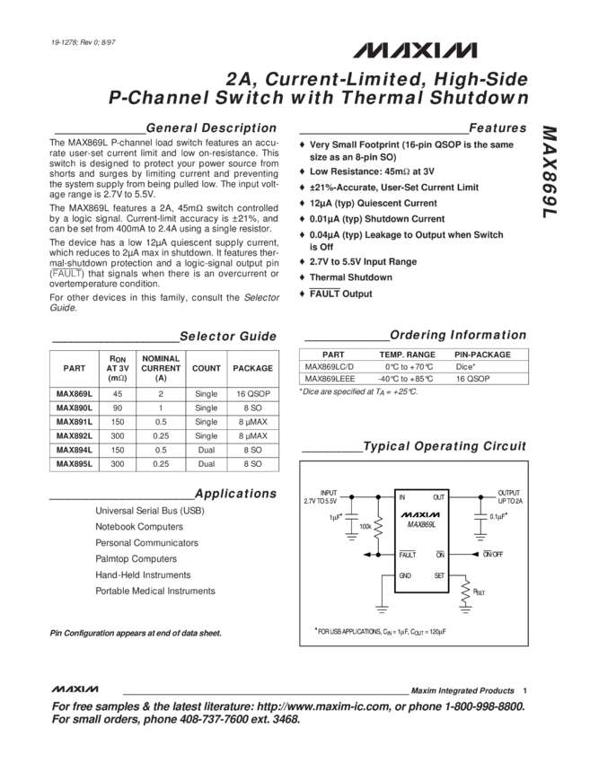 MAX869L 2A, Current-Limited, High-Side P-Channel Switch with Thermal Shutdown