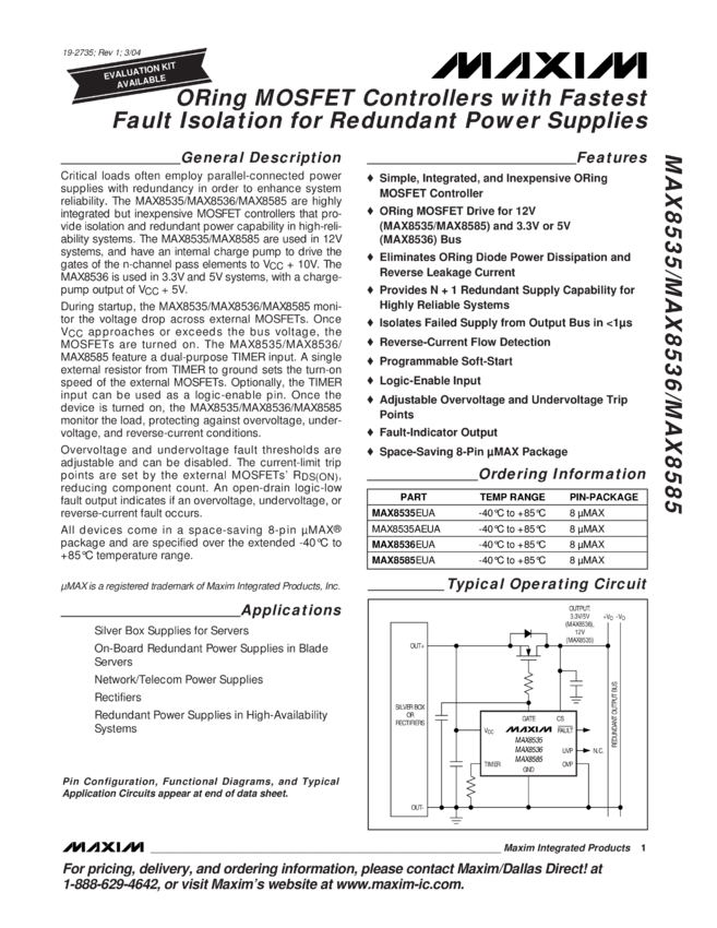 MAX8535, MAX8536, MAX8585 ORing MOSFET Controllers with Fastest Fault Isolation for Redundant Power Supplies
