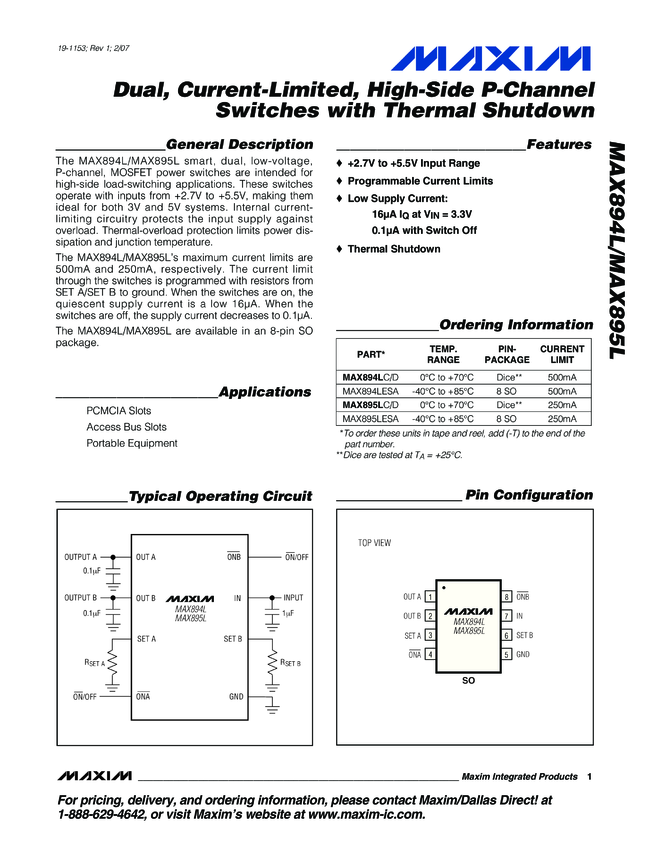 MAX894L, MAX895L Dual, Current-Limited, High-Side P-Channel Switches with Thermal Shutdown