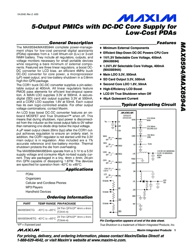 MAX8594 5-Output PMICs with DC-DC Core Supply for Low-Cost PDAs