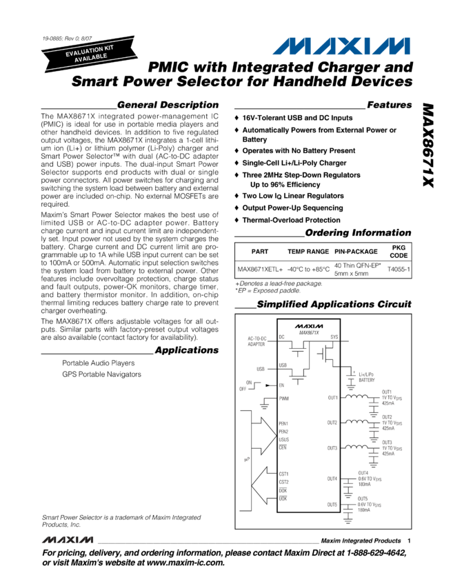 MAX8671X PMIC with Integrated Charger and Smart Power Selector for Handheld Devices