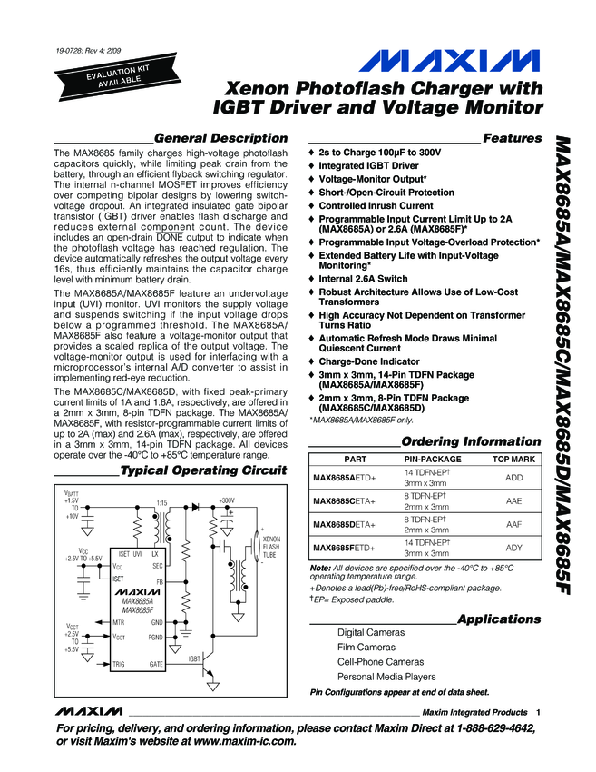 MAX8685A, MAX8685C, MAX8685D, MAX8685F Xenon Photoflash Charger with IGBT Driver and Voltage Monitor