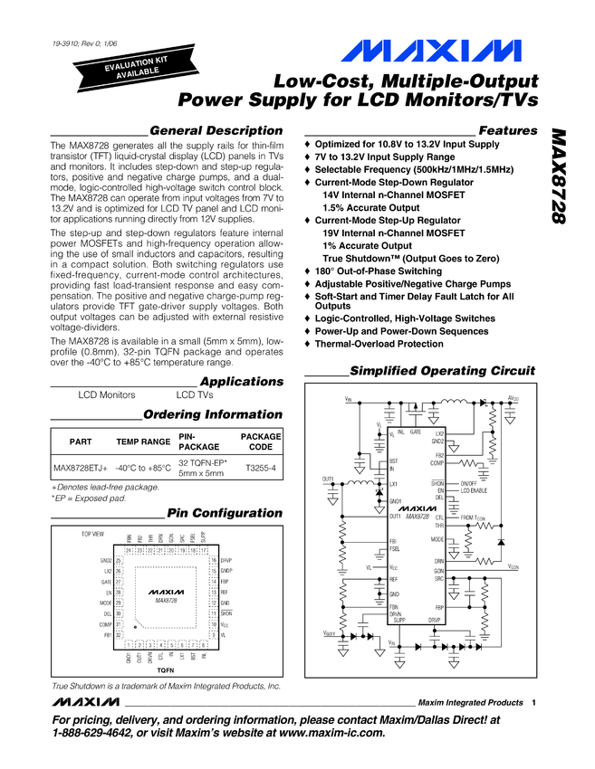 MAX8728 Low-Cost Multiple-Output Power Supply for LCD Monitors/TVs