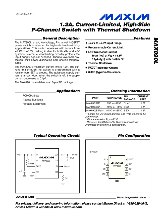 MAX890, MAX890L 1.2A, Current-Limited, High-Side P-Channel Switch with Thermal Shutdown