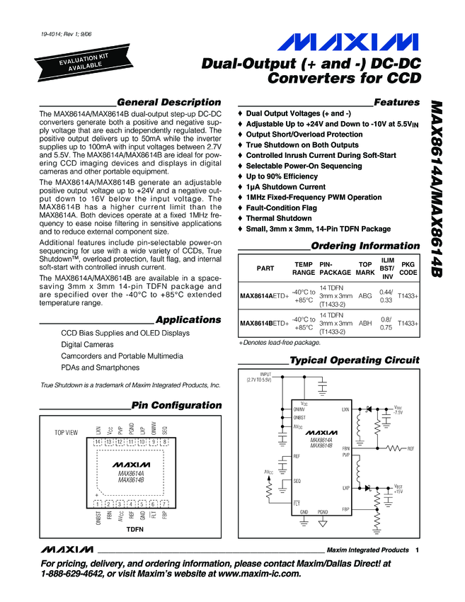 MAX8614A, MAX8614B Dual-Output (+ and -) DC-DC Converters for CCD