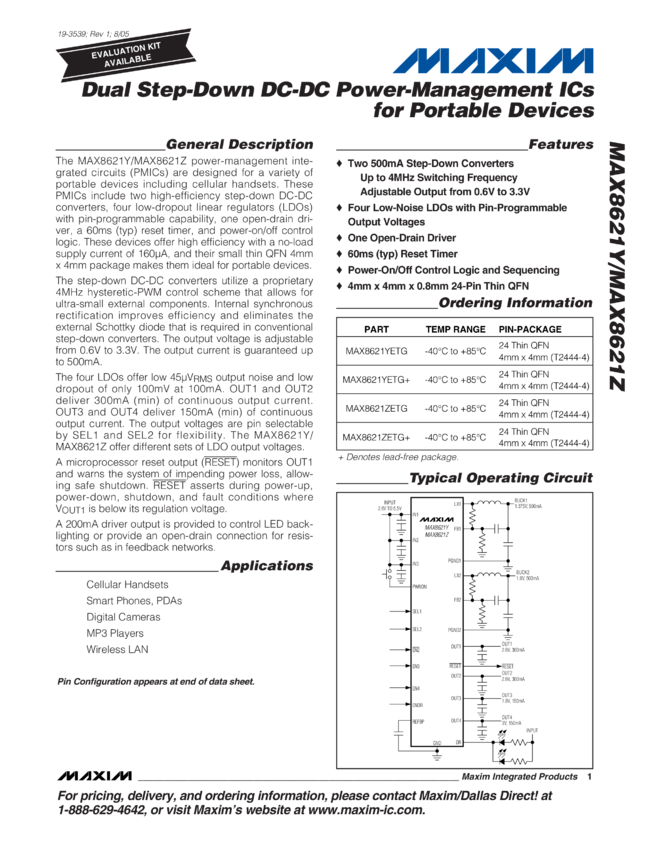 MAX8621Y, MAX8621Z Dual Step-Down DC-DC Power-Management ICs for Portable Devices
