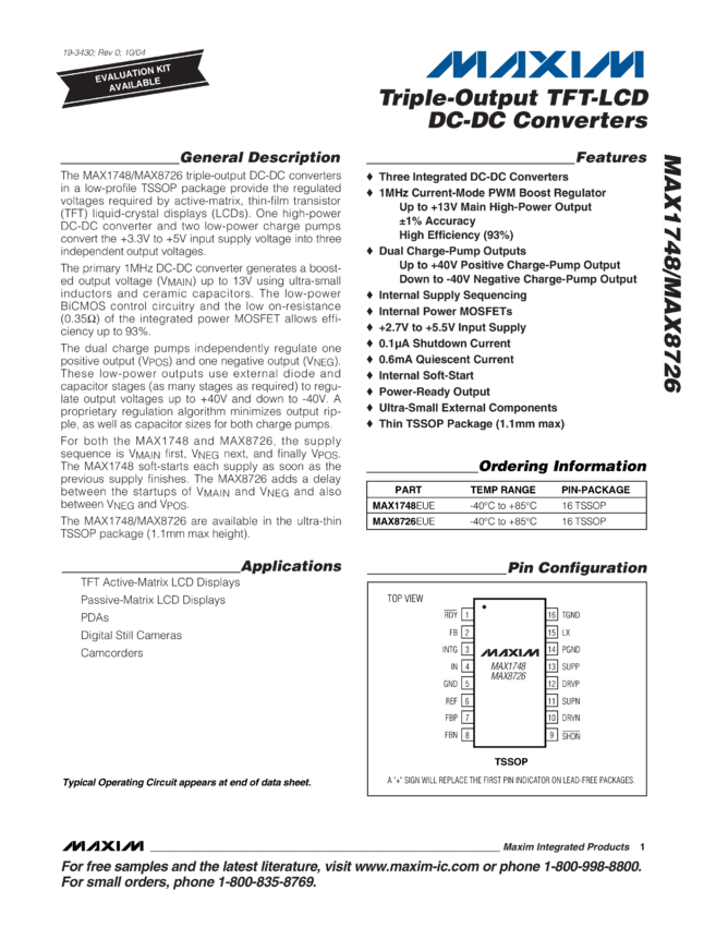 MAX1748, MAX8726 Triple-Output TFT-LCD DC-DC Converters