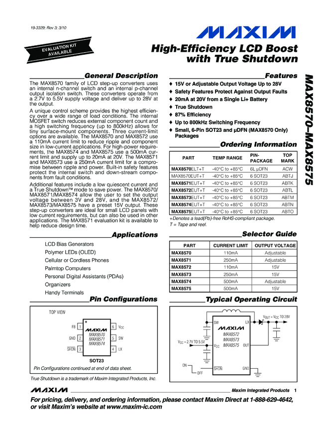 MAX8570, MAX8571, MAX8572, MAX8573, MAX8574, MAX8575 High-Efficiency LCD Boost with True Shutdown