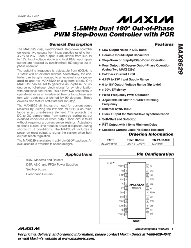 MAX8529 1.5MHz, Dual, 180° Out-of-Phase, PWM Step-Down Controller with POR