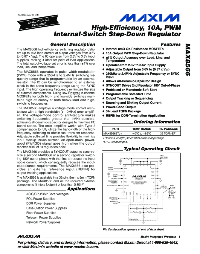 MAX8566 High-Efficiency, 10A, PWM Internal-Switch Step-Down Regulator