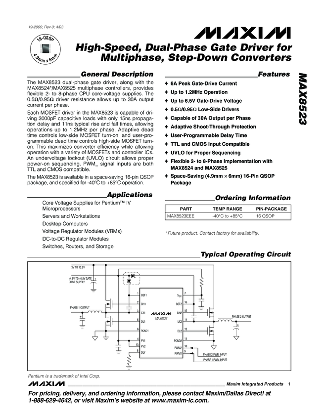 MAX8523 High-Speed, Dual-Phase Gate Driver for Multiphase, Step-Down Converters