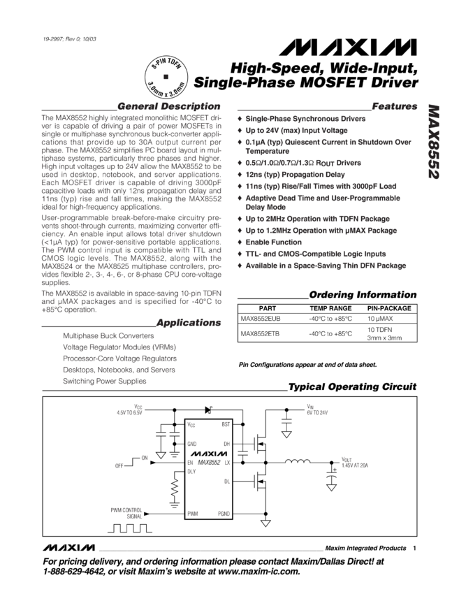 MAX8552 High-Speed, Wide-Input, Single-Phase MOSFET Driver