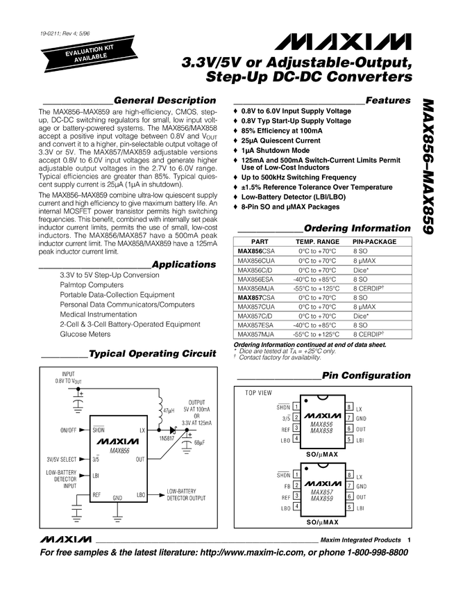 MAX856, MAX857, MAX858, MAX859 3.3V/5V or Adjustable Output, Step-Up DC-DC Converters