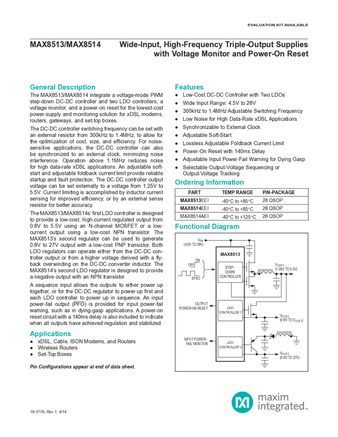 MAX8513, MAX8514 Wide-Input, High-Frequency, Triple-Output Supplies with Voltage Monitor and Power-On Reset