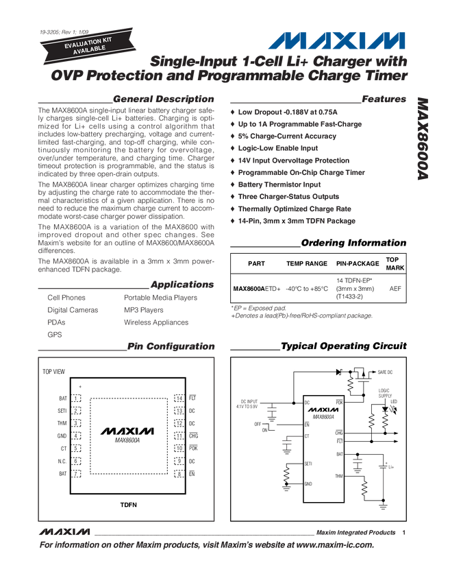 Single-Input 1-Cell Li+ Charger with OVP Protection and Programmable Charge Timer