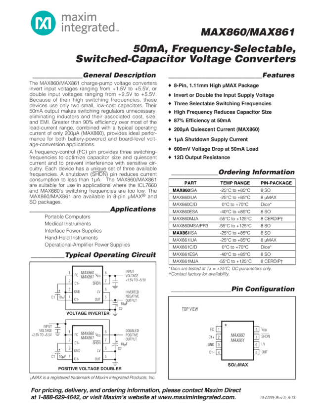 MAX860, MAX861 50mA, Frequency-Selectable, Switched-Capacitor Voltage Converters