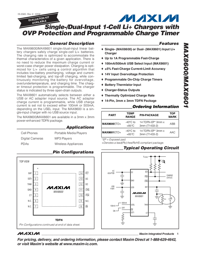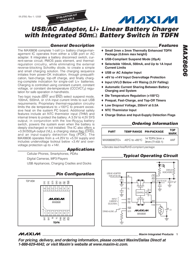 USB/AC Adapter, Li+ Linear Battery Charger with Integrated 50m Ohm Battery Switch in TDFN