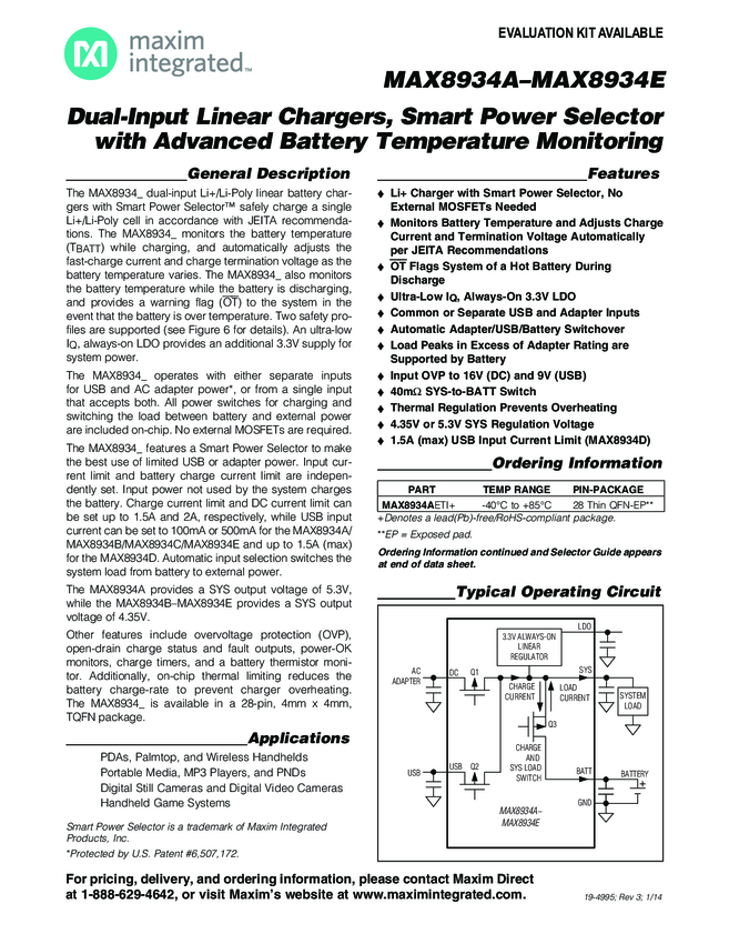 MAX8934A, MAX8934B, MAX8934C, MAX8934D, MAX8934E Dual-Input Linear Chargers, Smart Power Selector with Advanced Battery Temperature Monitoring
