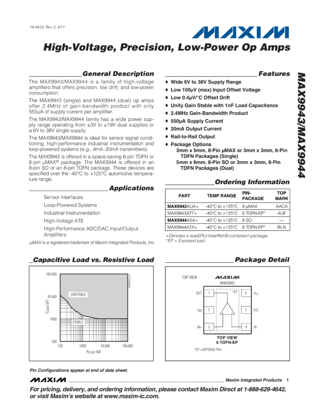 MAX9943, MAX9944 High-Voltage, Precision, Low-Power Op Amps