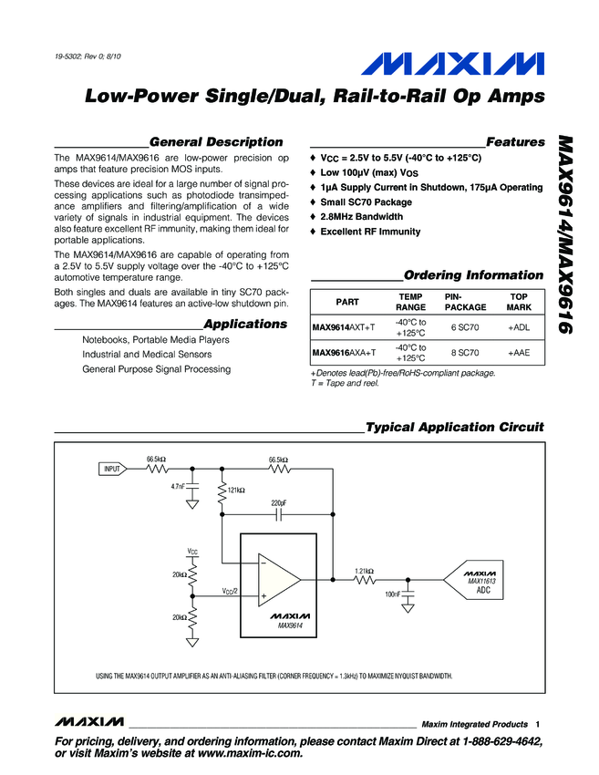 MAX9614, MAX9616 Low-Power Single/Dual, Rail-to-Rail Op Amps