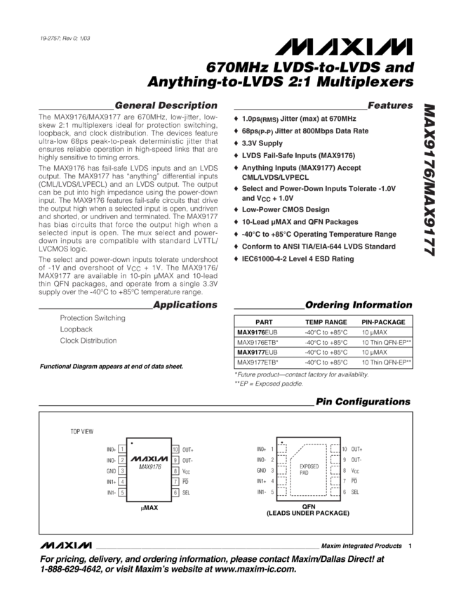 MAX9176, MAX9177 670MHz, LVDS-to-LVDS and Anything-to-LVDS, 2:1 Multiplexers