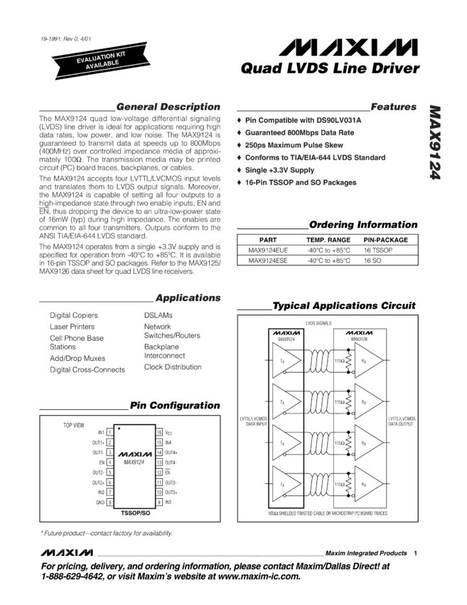 MAX9123 Quad LVDS Line Driver with Flow-Through Pinout