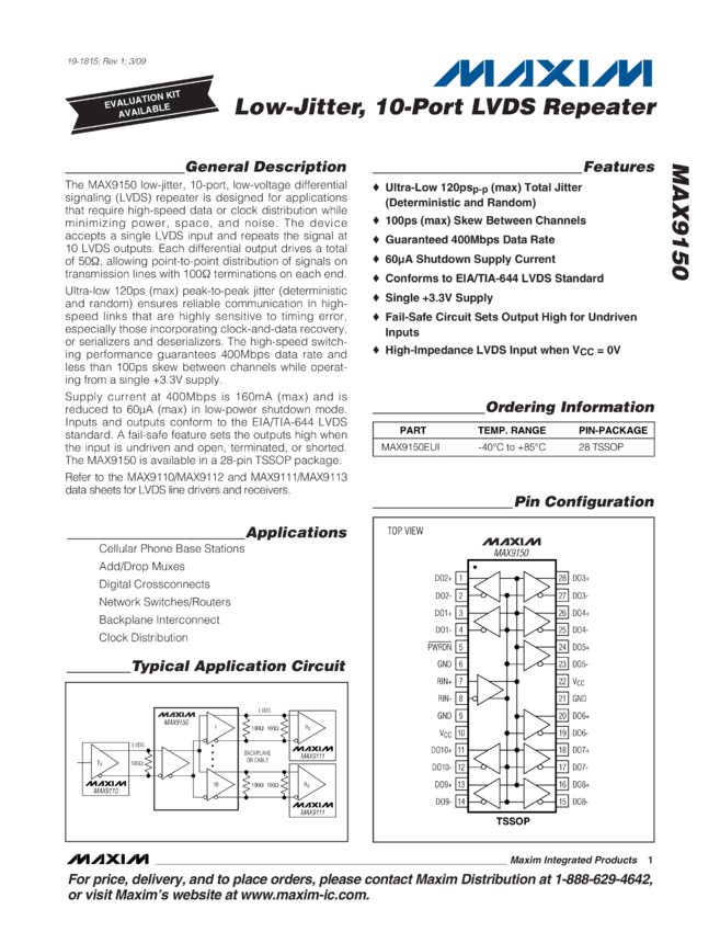 MAX9150 Low-Jitter, 10-Port LVDS Repeater