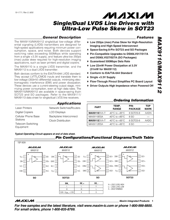 MAX9110, MAX9112 Single/Dual LVDS Line Driver with Ultra-Low Differential Skew in SOT23