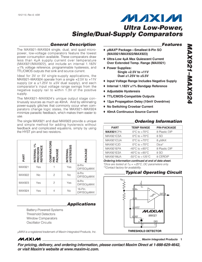 MAX921, MAX922, MAX923, MAX924 Ultra Low-Power, Single/Dual-Supply Comparators