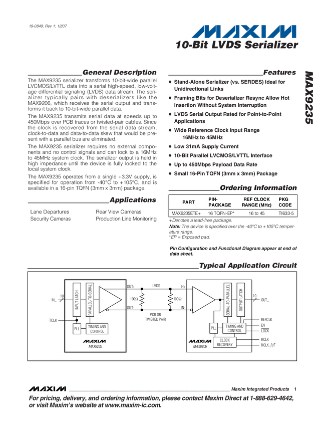 MAX9234, MAX9236, MAX9238 Hot-Swappable, 21-Bit, DC-Balanced LVDS Deserializers