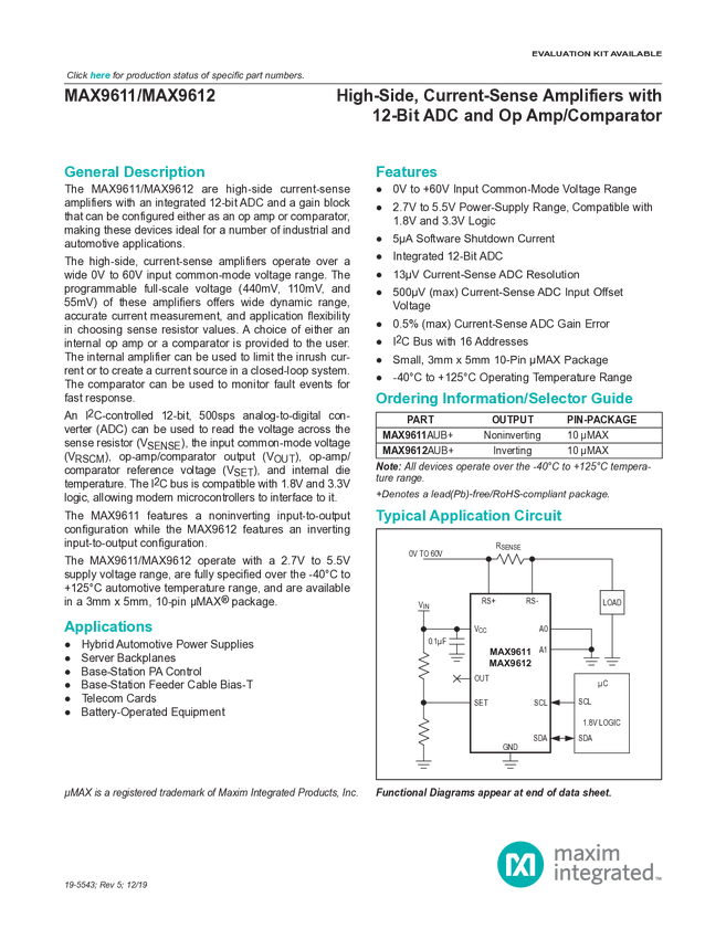 MAX9611, MAX9612 High-Side, Current-Sense Amplifiers with 12-Bit ADC and Op Amp/Comparator