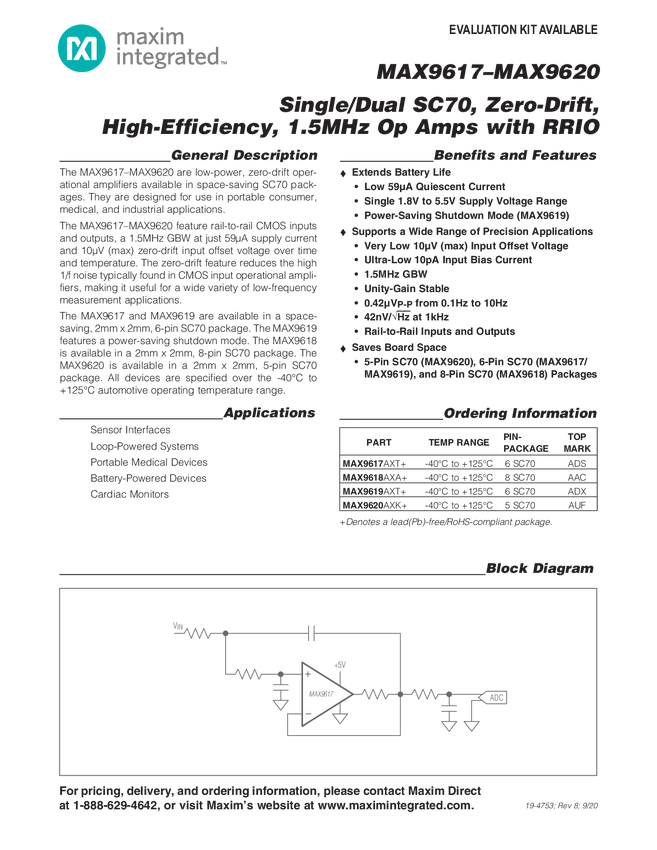 MAX9617, MAX9618, MAX9619, MAX9620 High-Efficiency, 1.5MHz Op Amps with RRIO