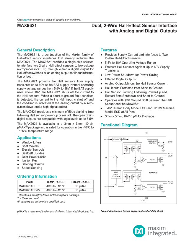 MAX9621 Dual, 2-Wire Hall-Effect Sensor Interface with Analog and Digital Outputs