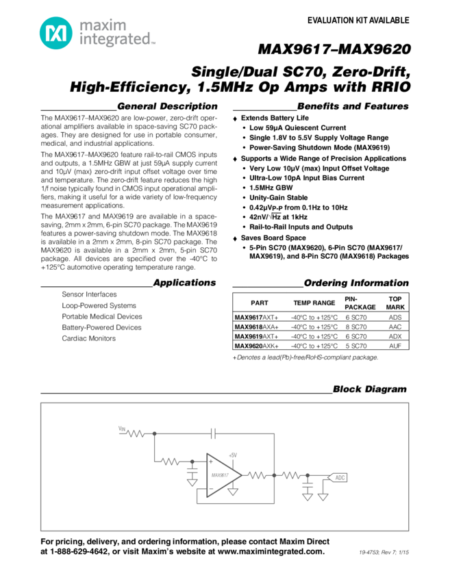 MAX9617, MAX9618, MAX9619, MAX9620 High-Efficiency, 1.5MHz Op Amps with RRIO