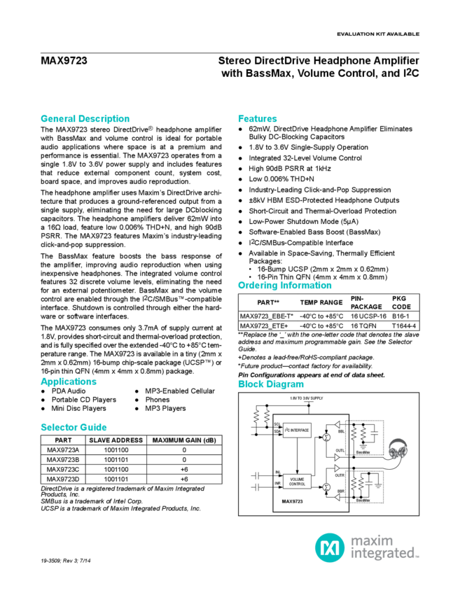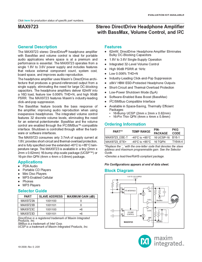 MAX9723 Stereo DirectDrive® Headphone Amplifier with BassMax, Volume Control, and I²C