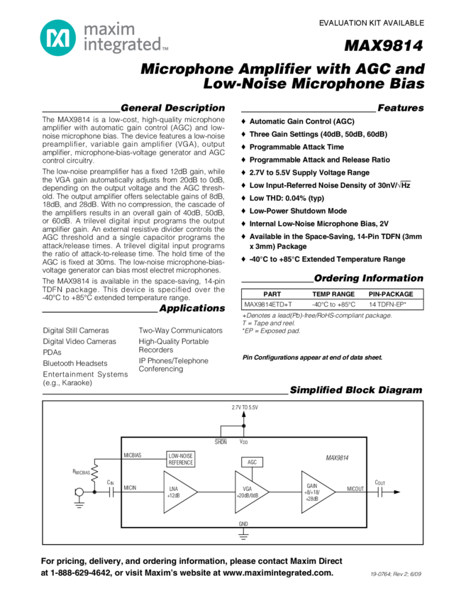 MAX9814 Microphone Amplifier with AGC and Low-Noise Microphone Bias