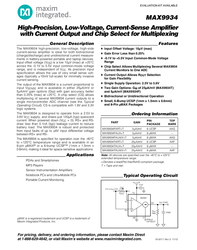MAX9934 High-Precision, Low-Voltage, Current-Sense Amplifier with Current Output and Chip Select for Multiplexing