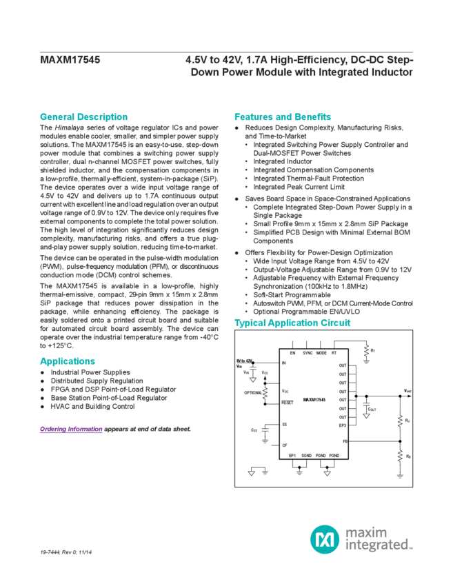 MAXM17545 4.5V-42V 1.7A, High Efficiency Synchronous Step-Down DC-DC Power Module with Integrated Inductor