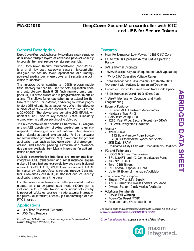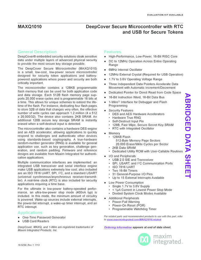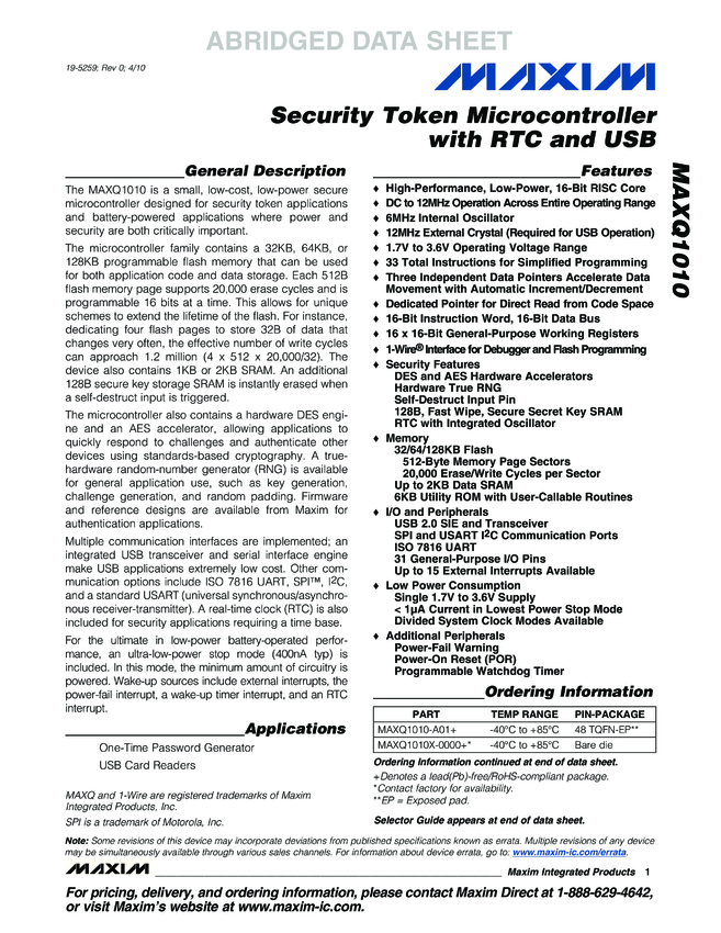 MAXQ1010, MAXQ1011, MAXQ1012 DeepCover Secure Microcontroller for Security Tokens with RTC and USB