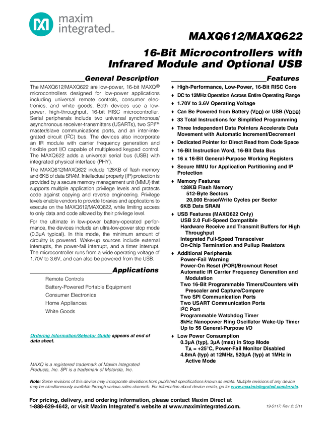 MAXQ612, MAXQ622 16-Bit Microcontrollers with Infrared Module and Optional USB