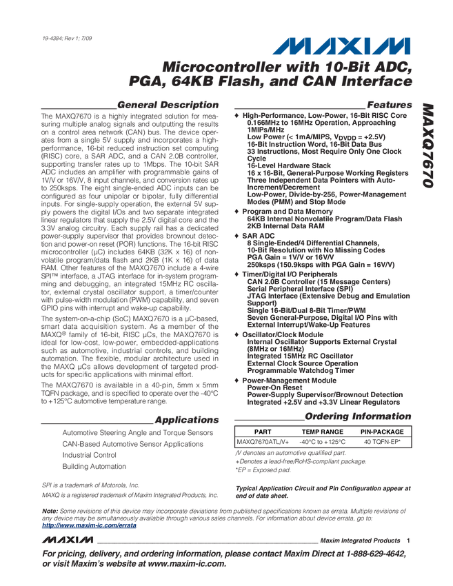 MAXQ7670A Microcontroller with 12-Bit ADC, PGA, 64KB Flash, and CAN Interface