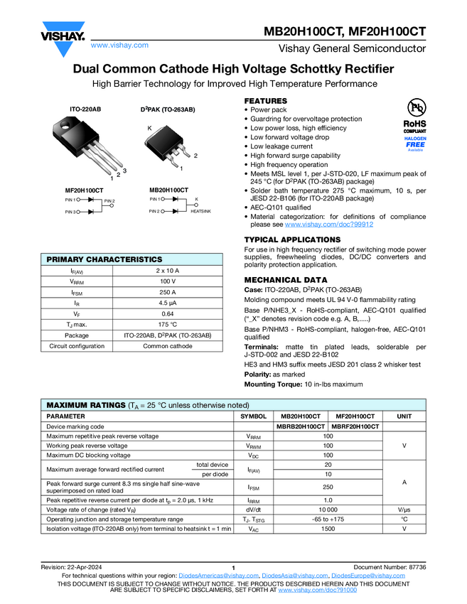 Dual Common Cathode High Voltage Schottky Rectifier High Barrier Technology for Improved High Temperature Performence