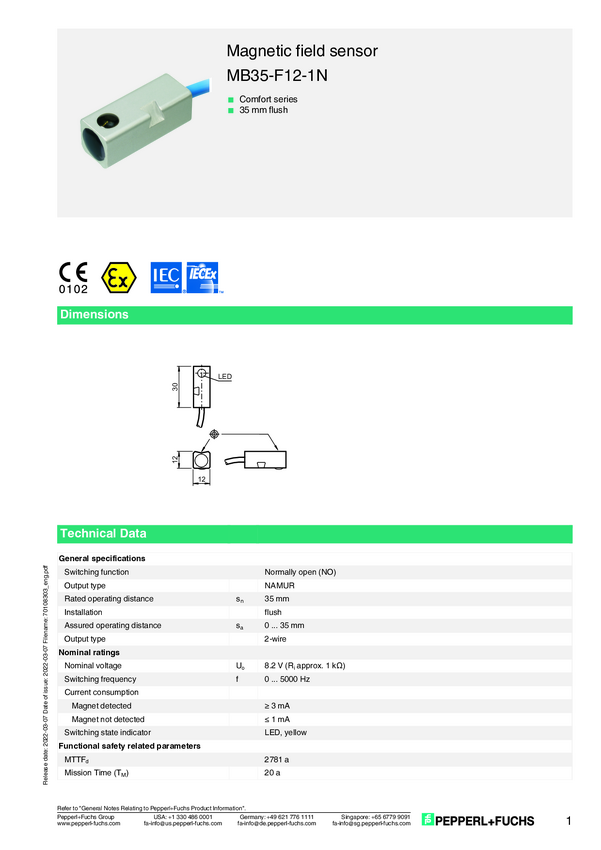 Pepperl+Fuchs Czujnik pola magnetycznego MB35-F12-1N 8.2 V (max) kabel